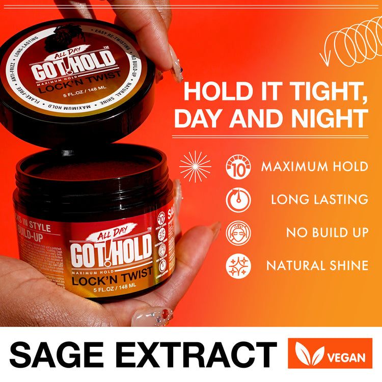 All Day Got Hold! Lock 'N Twist Maximum Hold is the ultimate styling solution for locs, twists, and natural styles! Designed to provide a firm yet flexible hold, this lightweight formula enhances twist definition, retwists locs with ease, and tames frizz without flaking or drying.