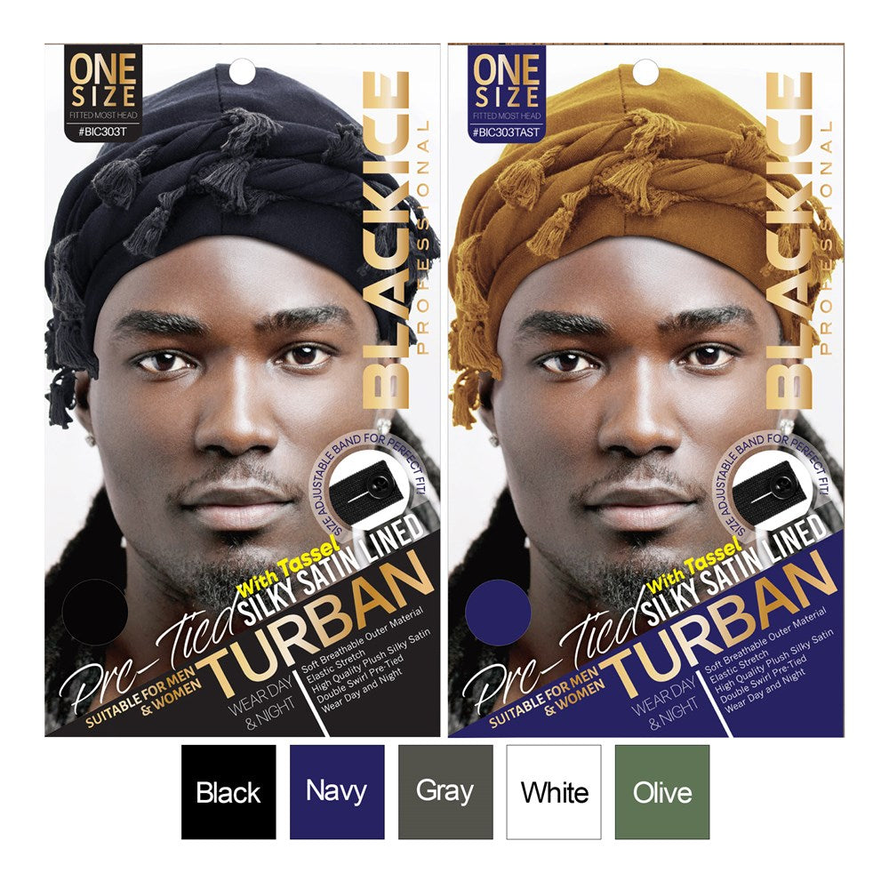 Black Ice Pre-Tied Silky Satin Lined Turban w/ Tassel is the new wave in mens and womens headwear. The modern day combination of fashion and utility has been revamped for ultra comfort and maximum health for your hair. We have used only the highest quality material for an enhanced comforting stretchy fit. So whether it's for your locs, waves, curls or fade; wear your perfect pre-tie with confidence!