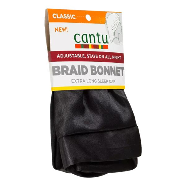 Unfold the Braid Bonnet and cover hair. Adjust the tie to suit your needs and secure the bonnet to lay down edges and protect your ends.