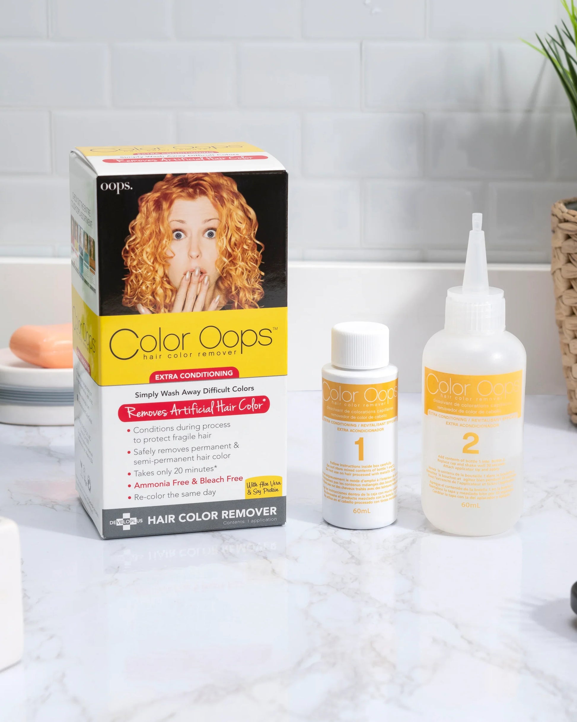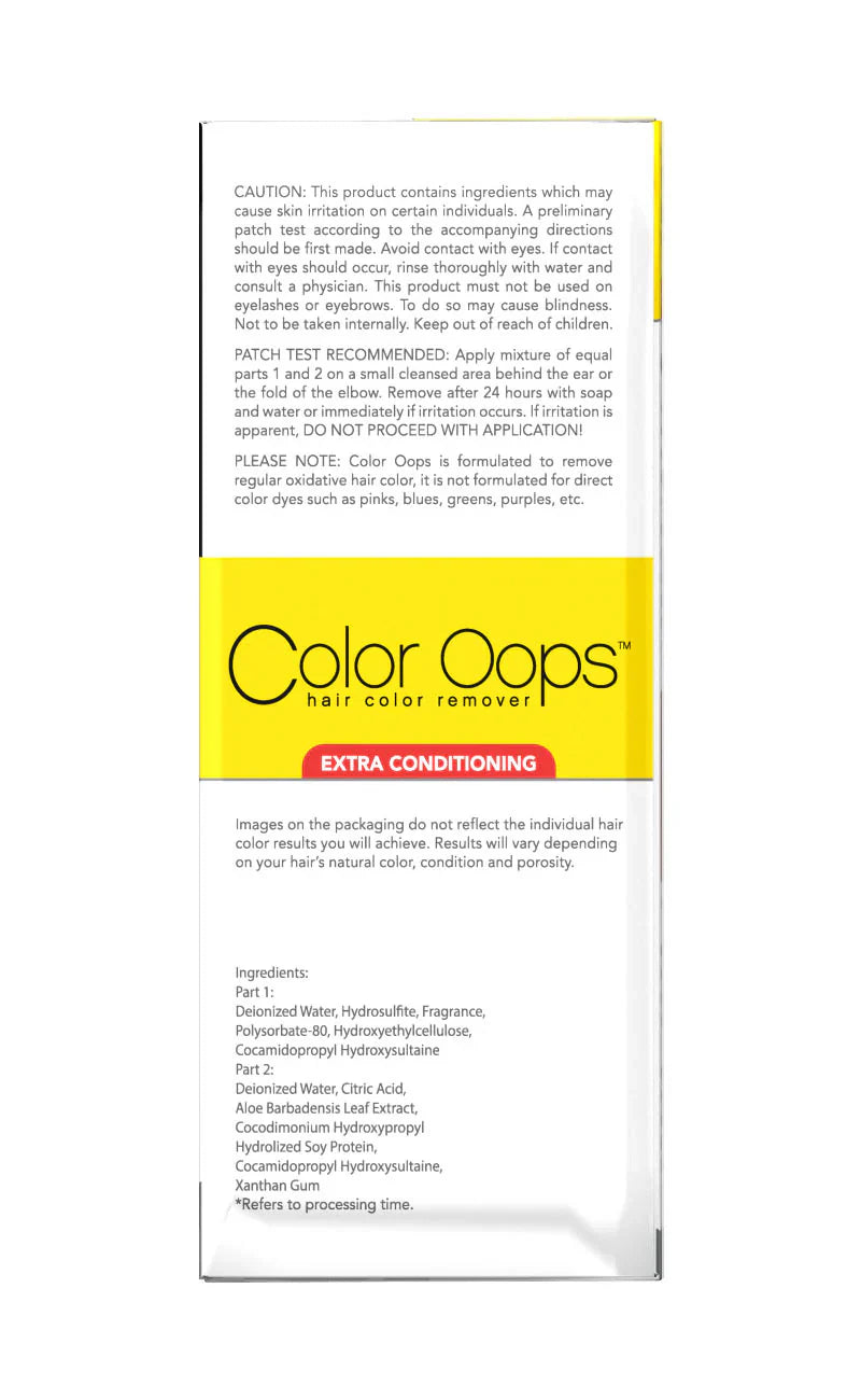 Color Oops Extra Conditioning Hair Color Remover is an easy and effective way to reverse undesirable hair color. Free from bleach and ammonia, our formula works by shrinking dye molecules, allowing you to simply wash them away. This formula includes aloe vera to nourish the follicle and provide hydration along with healing soy protein complex to rebuild and restructure processed hair.