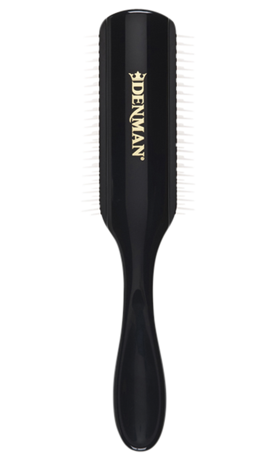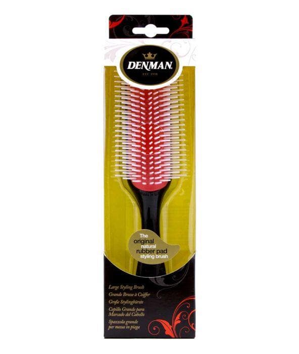 All black version of our large styling brush with 9 rows of nylon pins. The famous Denman anti-static rubber pad provides maximum grip and control during blow-drying for shaping hair.