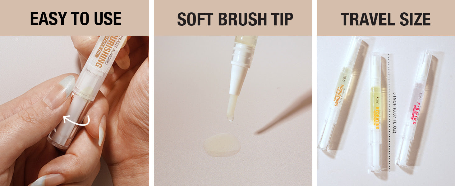 This cuticle oil come in a pen brush applicator that is convenient and spill free for quick and easy application that is also perfect travel size.