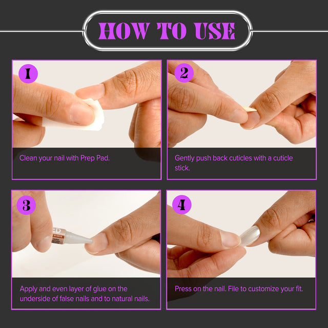 Dissolve false nails by soaking in an Artificial Nail Remover or Acetone. DO NOT USE FORCE. Any glue left on natural nails can be removed with Glue Remover.