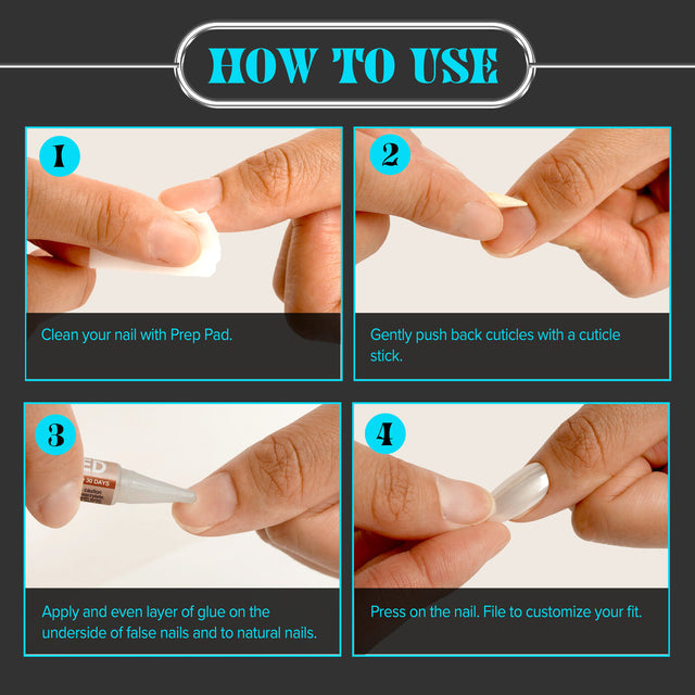 Dissolve false nails by soaking in an Artificial Nail Remover or Acetone. DO NOT USE FORCE. Any glue left on natural nails can be removed with Glue Remover.