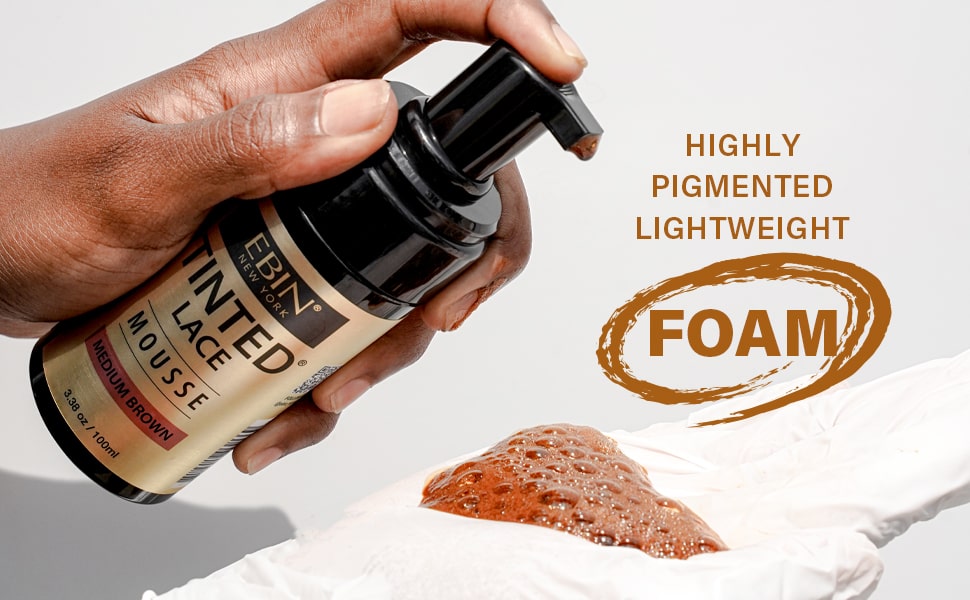 EBIN Tinted Lace Mousse is foaming type tint for your wig. This lightweight foam is highly pigmented, providing a natural-looking tint to your lace, perfectly matching your scalp for a flawless finish. The mousse is easy and convenient to use as it comes with built in pump and the use of hair dryer is recommended fort natural result as well as quick application.