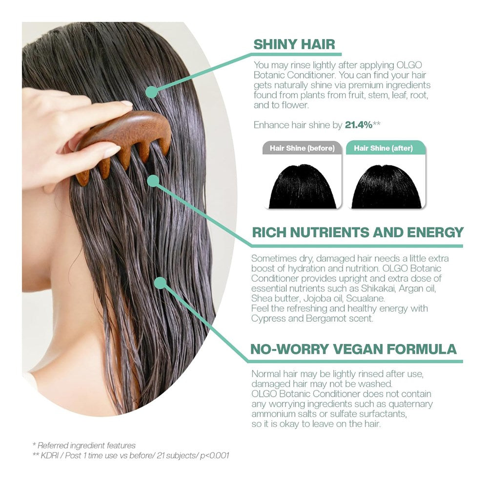 - SHINY HAIR: You may rinse lightly after applying OLGO Botanic Conditioner. You can find your hair gets naturally shine via premium ingredients found from plants from fruit, stem, leaf, root, and to flower. Enhance hair shine by 21.4%* (*KDRI / Post 1 time use vs before/ 21 subjects/ p<0.001)