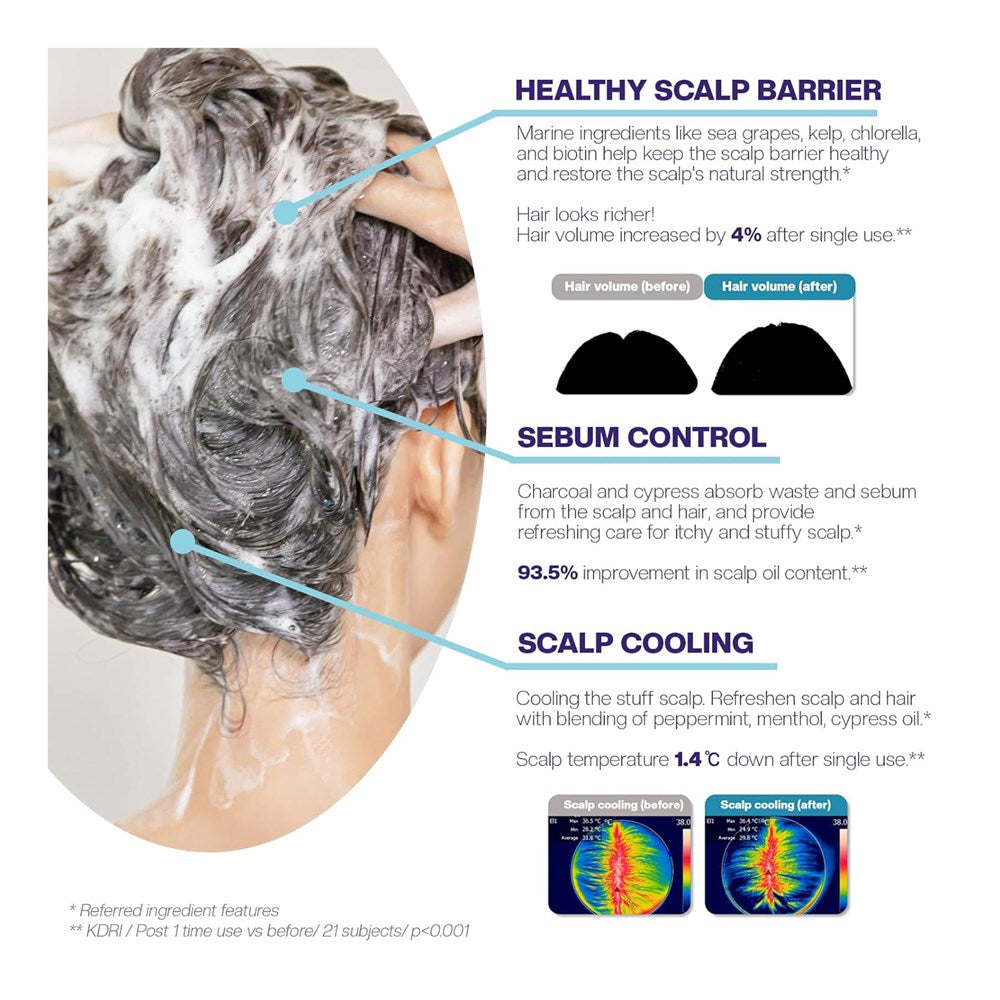 - SEBUM CONTROL: Marine shampoo absorbs dirts and sebum and provides refreshing care for itchy and stuffy scalp. 93.5% improvement in scalp oil content* (*KDRI.Post 1 time use vs before. 21 subjects)