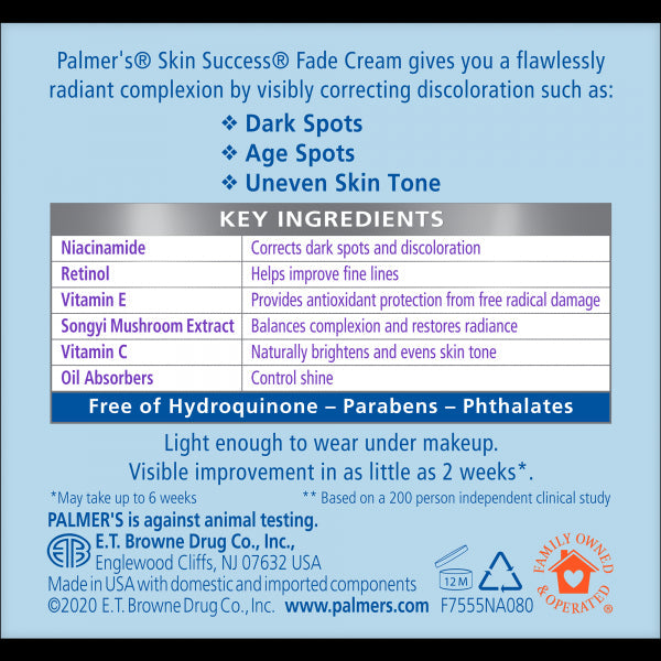Palmer's Skin Success Fade Cream gives you a flawlessly radiant complexion by effectively correcting discoloration such as dark spots, age spots and uneven skin tone.