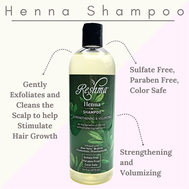 Reshma Beauty® Henna Shampoo contains all the strengthening and volumizing benefits of henna without altering hair color. Infused with aloe vera, Brahmi, chamomile, provitamin B5.