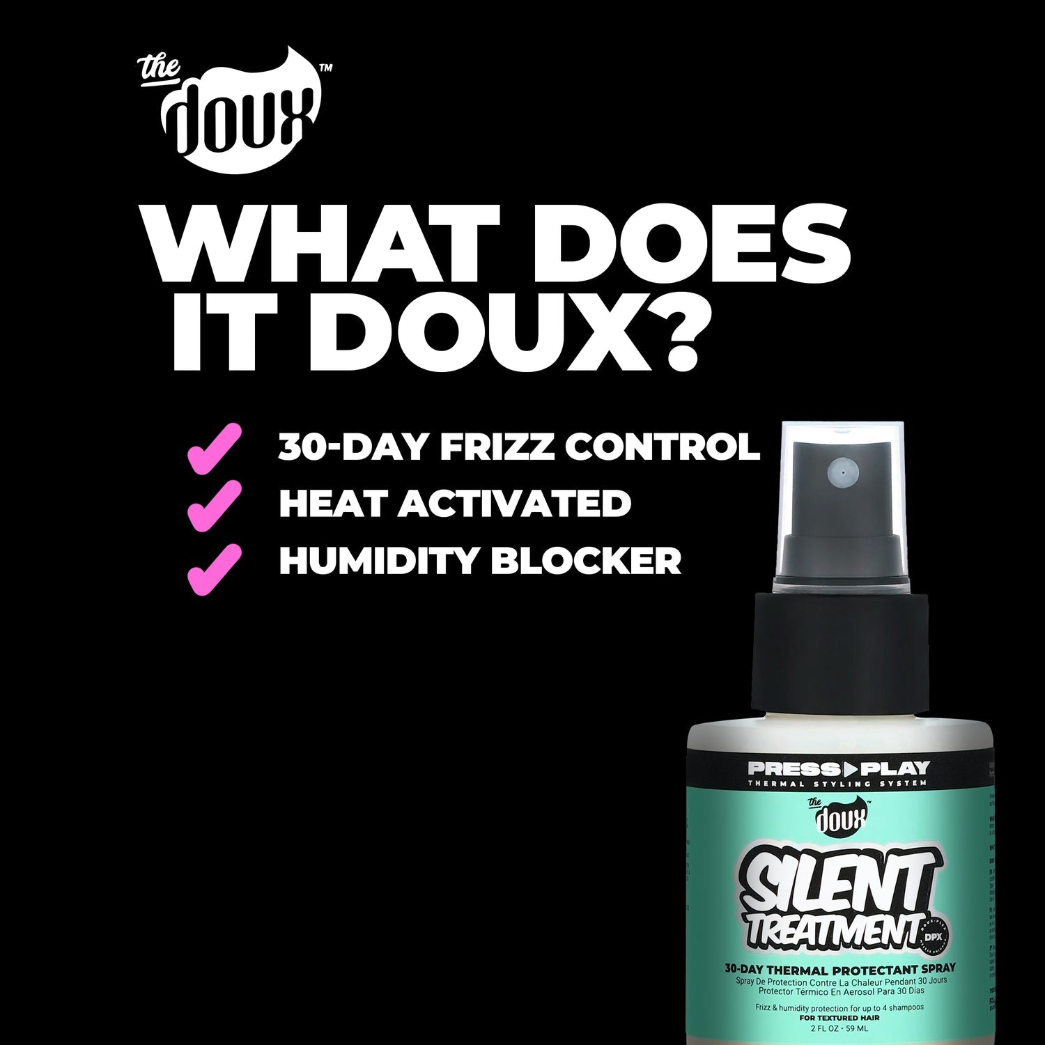 The Doux Press Play Silent Night 30-Day Anti-Humidity Spray is your silk press insurance! This heat-activated frizz defender, infused with Keratin and advanced strand-sealing tech, keeps hair sleek for up to 30 days or 4 shampoos. Salon emergencies? Handle that ish like a pro!